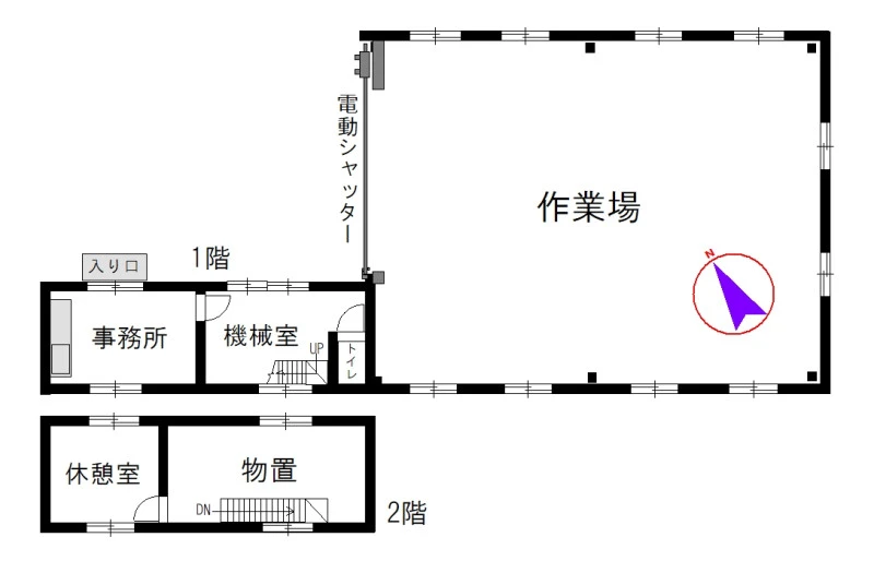 1階:作業場・事務所・機械室・トイレ/2階:休憩室・物置