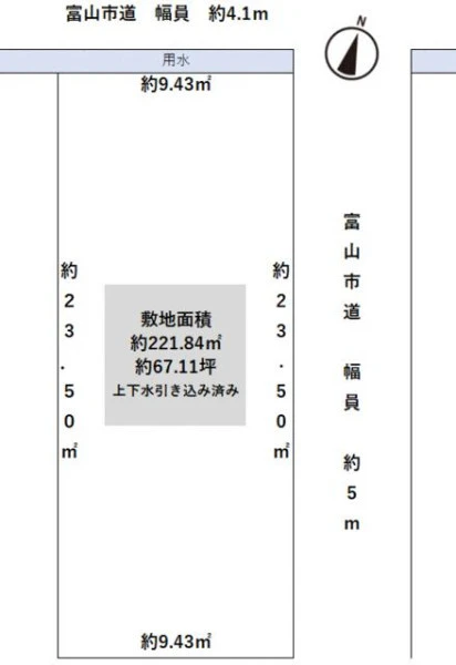 二方(除角地) 北 間口9.4m 公道 幅4.1m 東 間口23.5m 公道 幅5m |