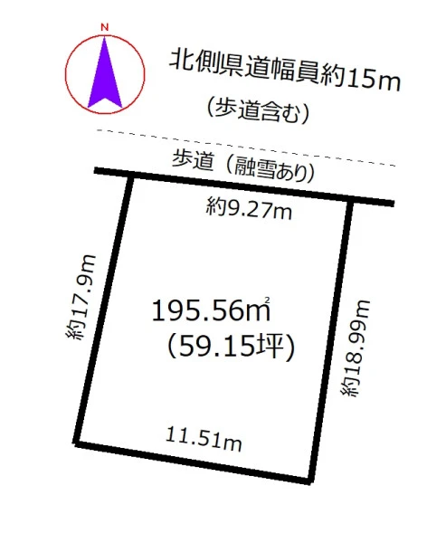 ・道路/北側県道幅員約15m(歩道含む・融雪なし)